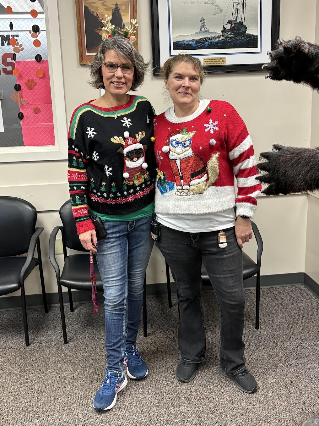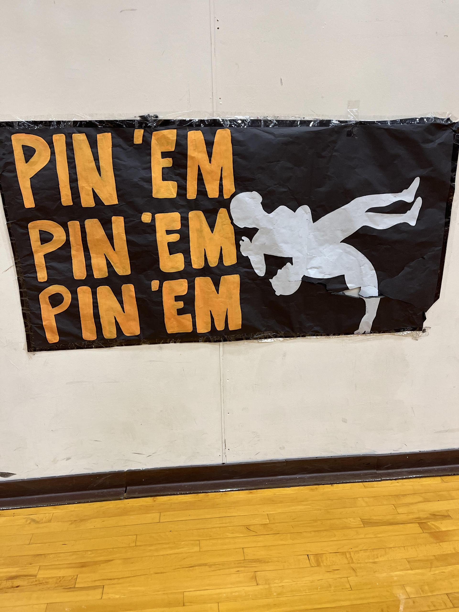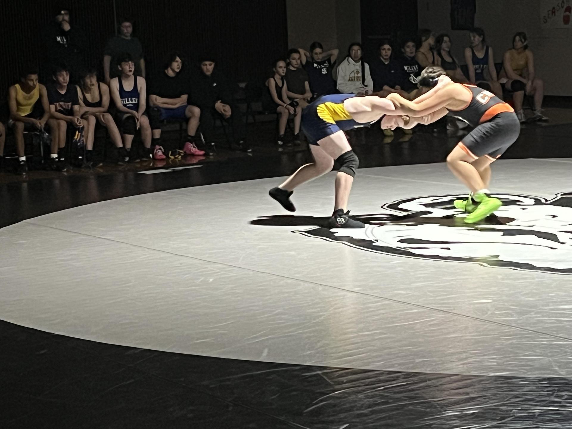 To the left we have two of our long serving para educators, Ms. Skinner and Ms. Webber, who double as the HMS Potty Patrol...escorting students who frequently "get lost" on their way to the restroom. Above and to the right is action from our Dual Match with Miller that happened on 12/18, and concluded our wrestling season. |
