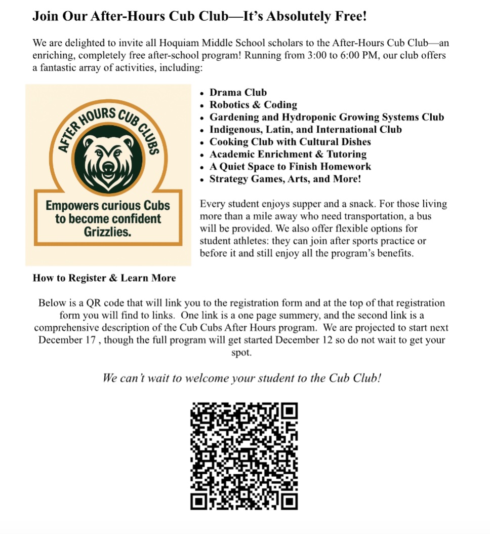 As we enter Holiday break, let me be the first to wish you a Happy New Year. I know that we aren't through December yet, but I wanted to get the newsletter out before break for our Hoquiam Middle School families! I hope you have a great break, and then join me in a big welcome to January! As we are looking forward to the second half of the school year, I want to thank you for the care you show our students each day. Coming back from winter break can be both exciting and challenging for middle schoolers, and we appreciate your help in reestablishing routines, encouraging positive habits, and reinforcing the importance of attendance and making an effort in the classroom.